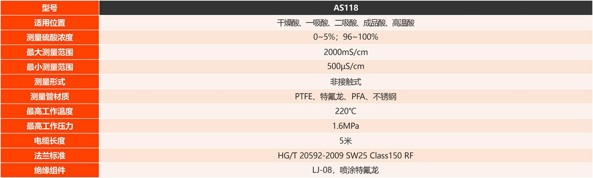 AS118傳感器適用于高溫酸、干燥酸、一吸酸、成品酸以及稀釋硫酸等多種環(huán)境下的應用。該傳感器的測量準確性不受介質(zhì)流速和流向的影響,但無法測量含有氣體的介質(zhì)電導率因此必須確保測量介質(zhì)是流動的且不含氣體。AS118傳感器的測量管采用不銹鋼材質(zhì)并內(nèi)襯聚四氟乙烯,安裝法蘭由耐腐蝕材料制成,而溫度傳感器作為獨立元件,安裝在傳感器出口的溫度套管中。傳感器的感應線圈則安裝在內(nèi)襯聚四氟乙烯的測量管外部,允許高溫硫酸或堿液等介質(zhì)在測量管內(nèi)部流動。