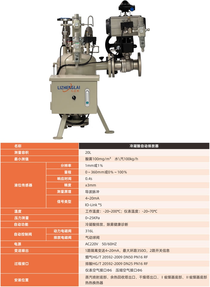 1.可安裝在蒸汽噴射底部、余熱回收塔出口、干燥塔出口、Ⅰ省煤器底部、Ⅱ省煤器底部、熱熱換熱器代替?zhèn)鹘y(tǒng)手動(dòng)排放和冷凝酸桶。